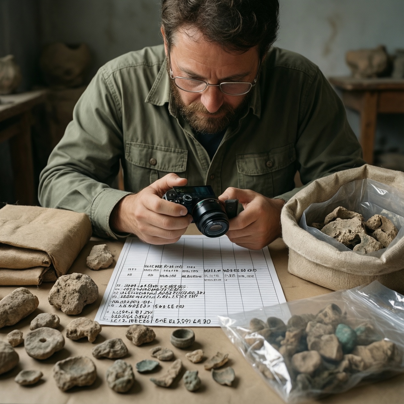 Минимальный набор: смартфон/камера, штатив или упор, однотонный фон, линейка или фотомасштаб, карточка с ID, мягкая кисть для сухой очистки (без воды и химии), перчатки (по материалу находки), приложение для заметок/таблица, а также приложение для учета и каталогизации находок или его замена (таблица + фотоархив).
